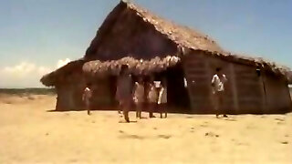 Three guys ravage a hairy pussy doll outside on the beach