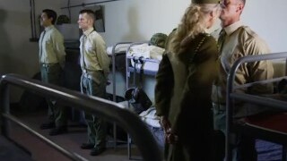 Platinum-blonde Schlampe fickt mit ekligen Typen